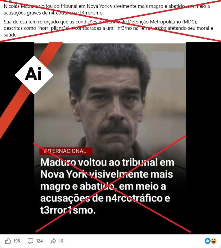 “Maduro voltou ao tribunal em Nova York visivelmente mais magro e abatido, em meio a acusações de narcotráfico e terrorismo”, diz a legenda que acompanha uma foto no Instagram, no Facebook, no X, no Threads e no Kwai.