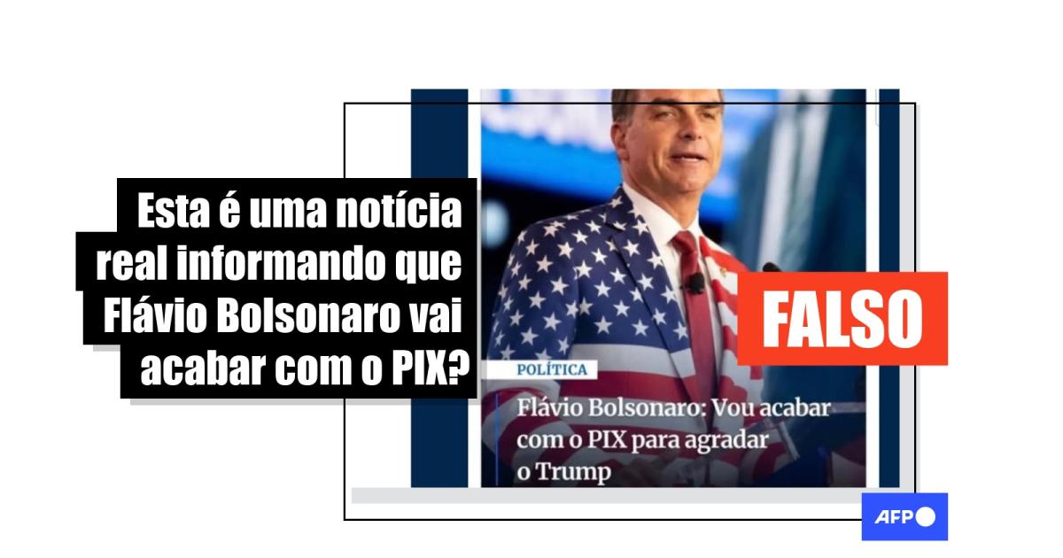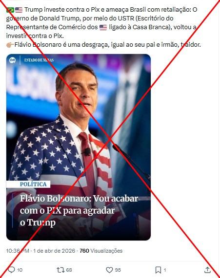 Em abril de 2026, o governo dos Estados Unidos voltou a criticar o sistema de pagamento instantâneo brasileiro PIX. Dias depois, posts com centenas de interações nas redes sociais passaram a compartilhar uma suposta manchete noticiando que o senador e pré-candidato à Presidência Flávio Bolsonaro (PL) teria dito que "vai acabar com o PIX para agradar o Trump". Isso é falso: o conteúdo não foi publicado pelo veículo cuja logo aparece nos posts virais e o senador negou ter intenção de acabar com o sistema de pagamentos.