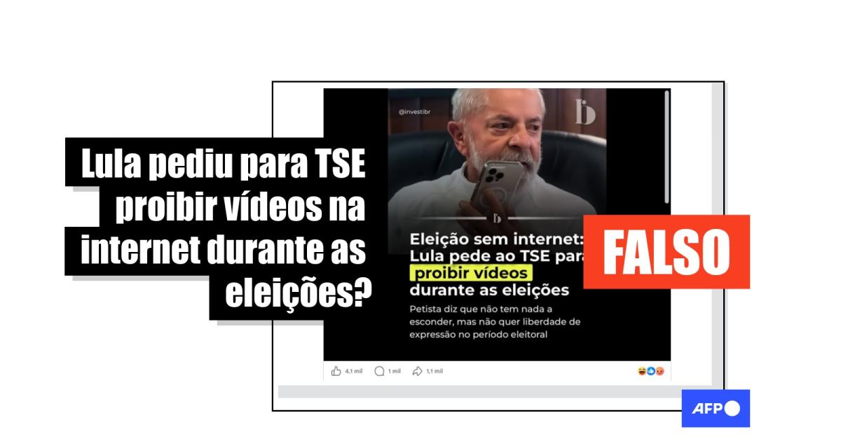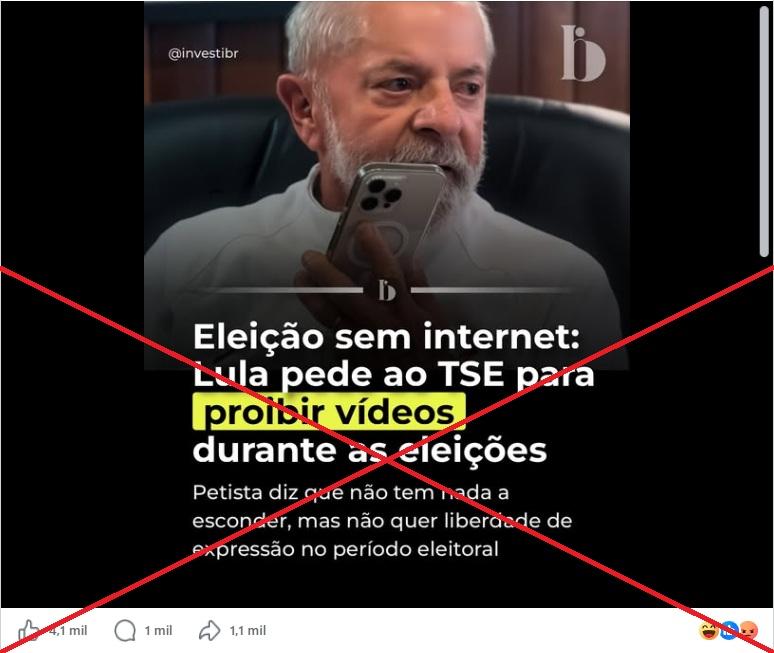 “Eleição sem internet: Lula pede ao TSE para proibir vídeos durante eleições. Petista diz que não tem nada a esconder, mas não quer liberdade de expressão no período eleitoral”, lê-se em uma imagem que circula no Facebook, no Kwai, no X e no Instagram.
