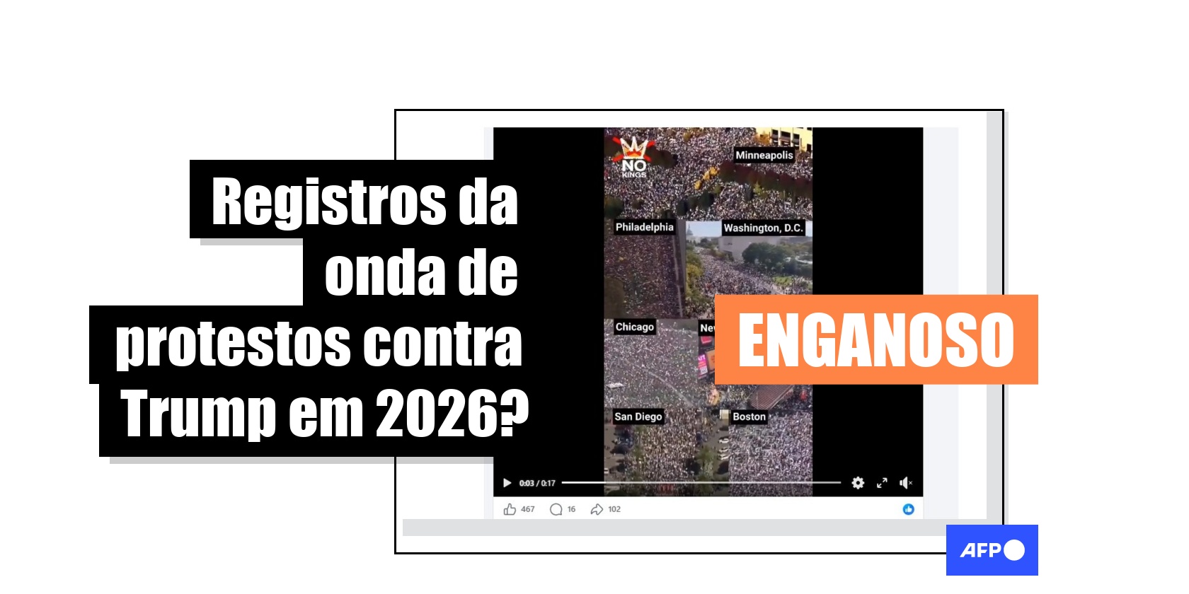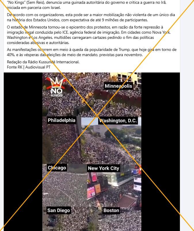 Em 28 de março de 2026, o movimento “No Kings” realizou sua terceira onda de protestos contra as políticas do presidente norte-americano Donald Trump em diferentes cidades dos Estados Unidos. Desde então, um vídeo com tomadas aéreas de manifestações foi visualizado mais de 25 mil vezes nas redes sociais como se mostrasse a recente mobilização. Mas, embora as sequências correspondam a marchas anti-Trump realizadas pelo movimento, os registros são de outubro de 2025, durante a segunda onda de manifestações.
