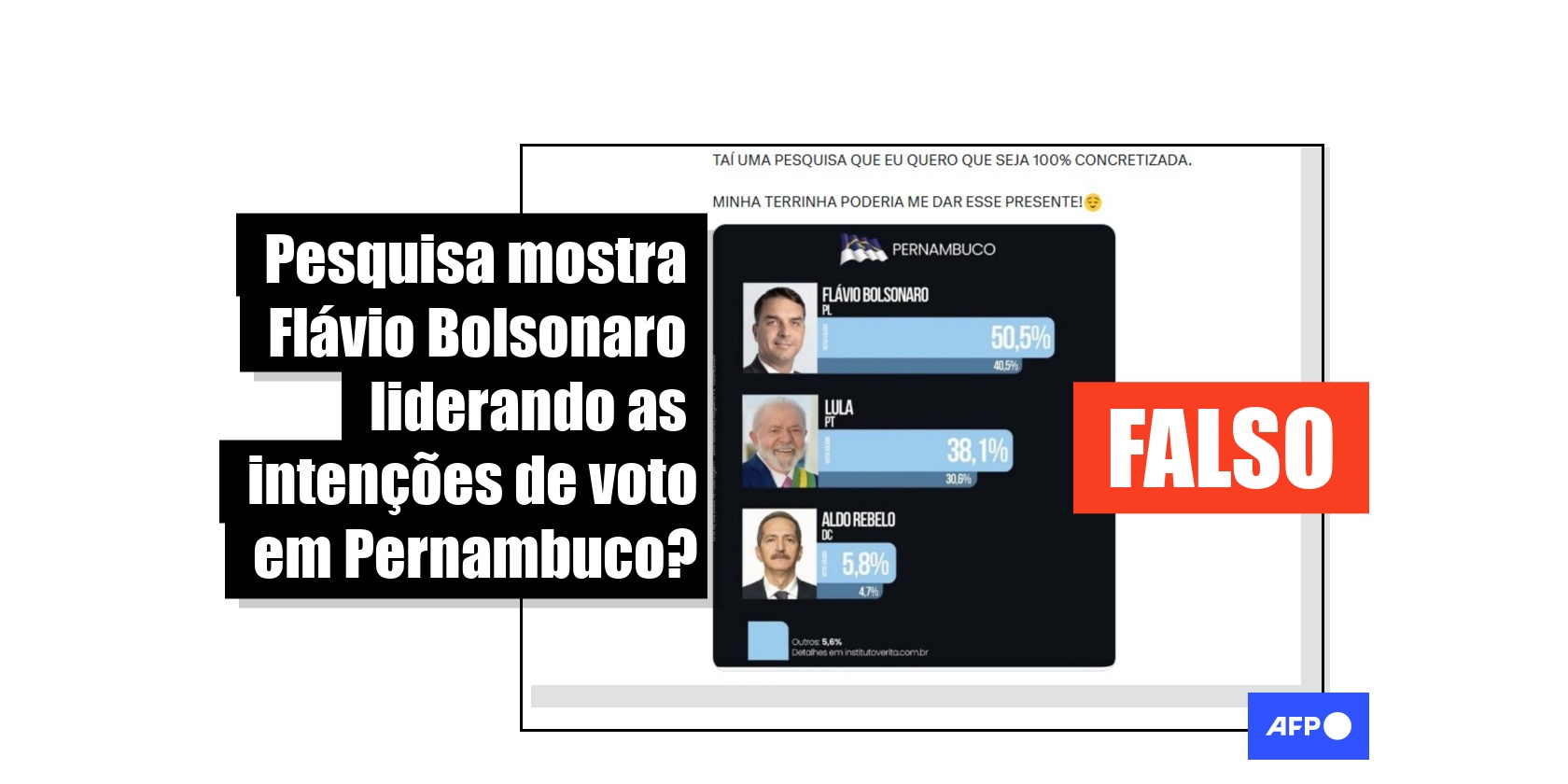 As publicações compartilham uma imagem de uma pesquisa eleitoral feita no estado de Pernambuco, na qual Flávio Bolsonaro parece liderar as intenções de voto com 50,5%. Em seguida, estão Lula, com 38,1%, e Aldo Rebelo (DC), com 5,8%. Um link exibido na parte inferior da imagem mostra que o levantamento foi feito pelo Instituto Veritá.