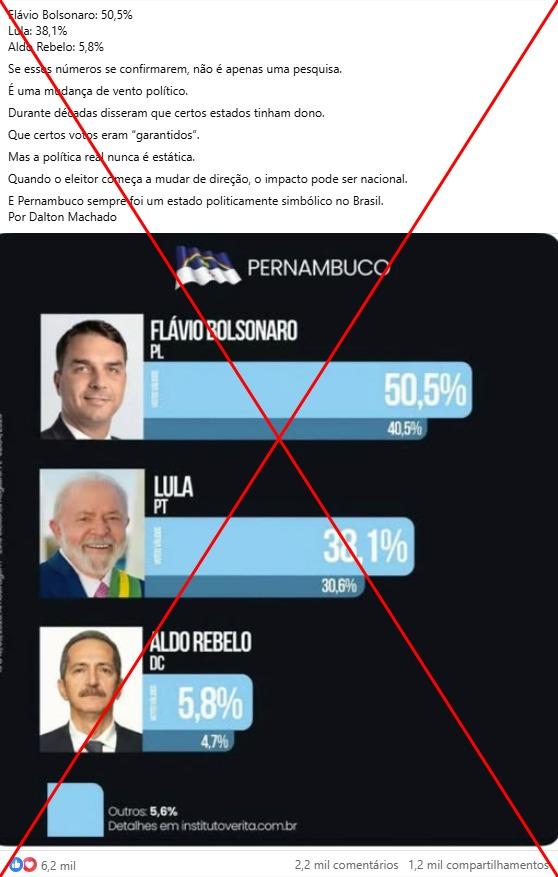 “PERNAMBUCO SURPREENDE O BRASIL! Nova pesquisa mostra um cenário que muita gente não esperava ver no Nordeste: Flávio Bolsonaro: 50,5%, Lula: 38,1%, Aldo Rebelo: 5,8%. Se esses números se confirmarem, não é apenas uma pesquisa. É uma mudança de vento político”, diz uma das publicações compartilhadas no Facebook, no Instagram e no X.
