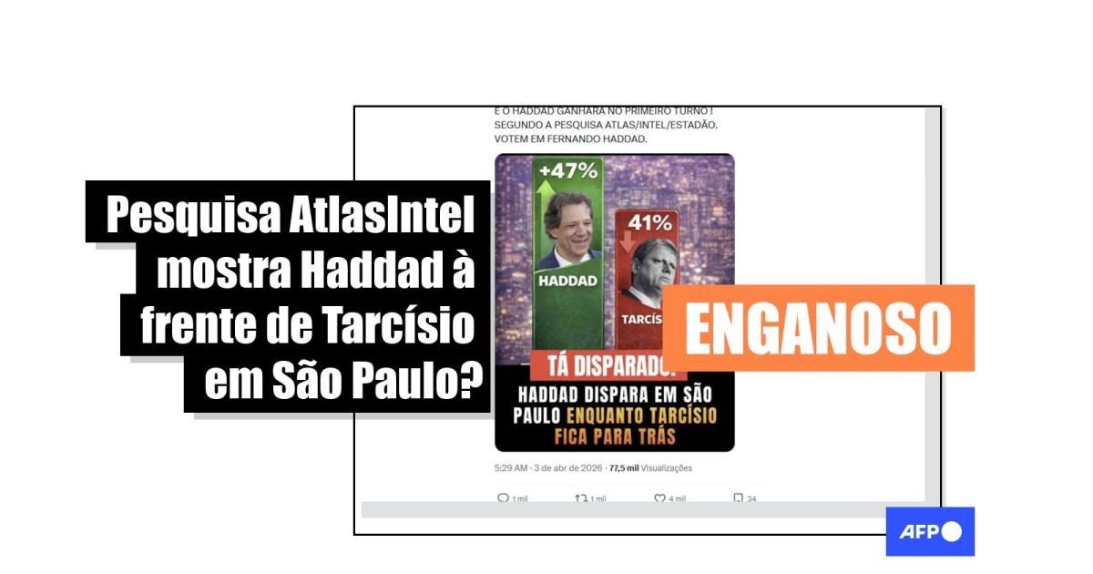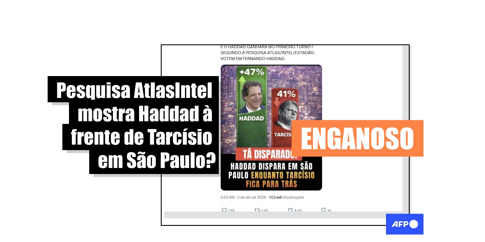 No fim de março de 2026, o Partido dos Trabalhadores (PT) confirmou a pré-candidatura do ex-ministro da Fazenda Fernando Haddad (PT) ao governo de São Paulo. Neste contexto, publicações visualizadas mais de 252 mil vezes nas redes sociais compartilham um gráfico que parece mostrar Haddad à frente do governador Tarcísio de Freitas (Republicanos) na disputa pelo governo do estado. Mas, na verdade, os números correspondem aos resultados obtidos apenas na capital paulista. A pesquisa eleitoral completa, feita pelo Instituto AtlasIntel, mostra que Tarcísio lidera no estado em todos os cenários.
