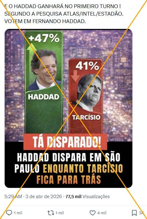 “Haddad ganhará no PRIMEIRO TURNO para governador de São Paulo! Segundo a pesquisa ATLAS/INTEL/ESTADÃO”, diz uma das publicações compartilhadas no Facebook, no Instagram, no Threads, no X, no TikTok e no YouTube.