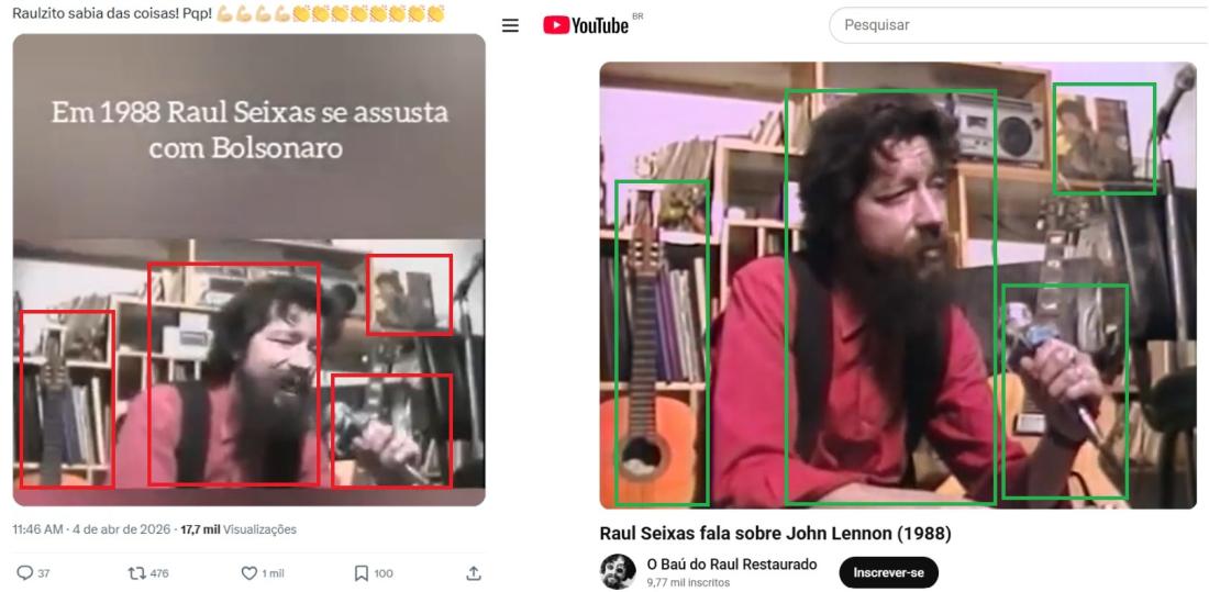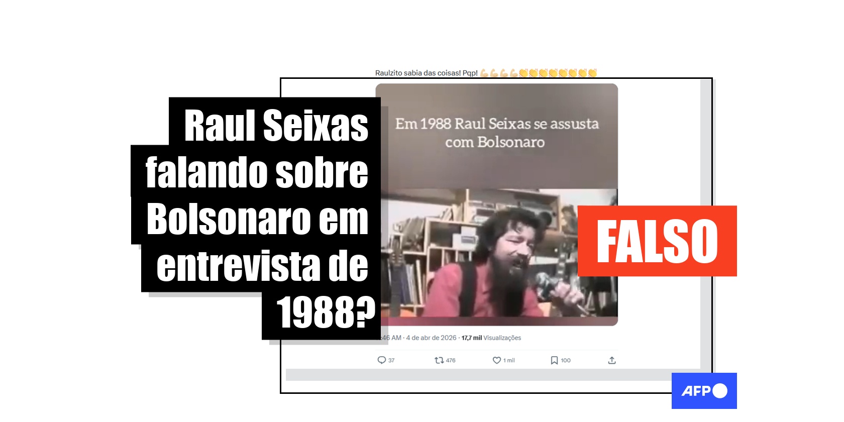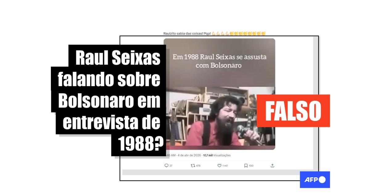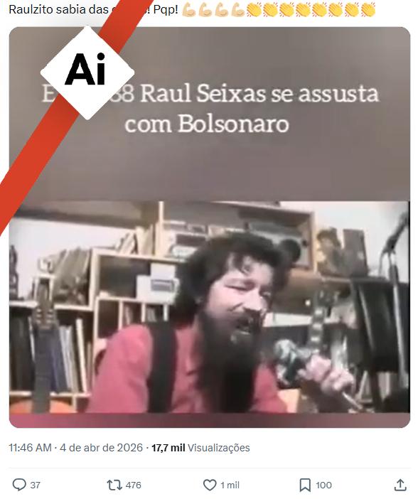 Um vídeo em que o cantor Raul Seixas supostamente critica, em 1988, o ex-presidente Jair Bolsonaro e afirma que o político é um “fanático pela ditadura” foi visualizado mais de 556 mil vezes nas redes sociais desde 5 de abril de 2026. Mas a fala é falsa: a gravação manipula uma entrevista do cantor com o uso de inteligência artificial (IA).