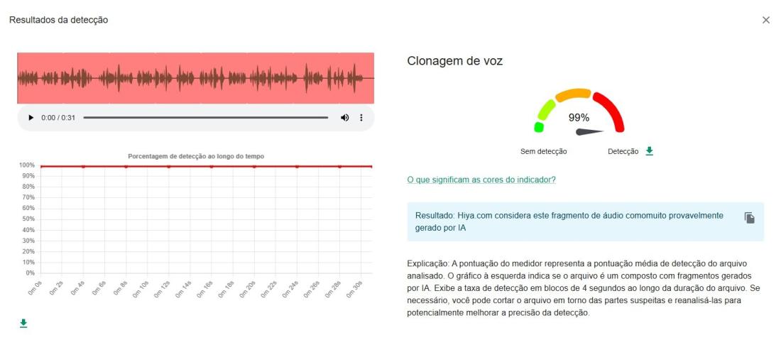 Uma análise do áudio viralizado com a ferramenta Hiya do InVID WeVerify, indicou 99% de probabilidade do discurso ter sido gerado por inteligência artificial.