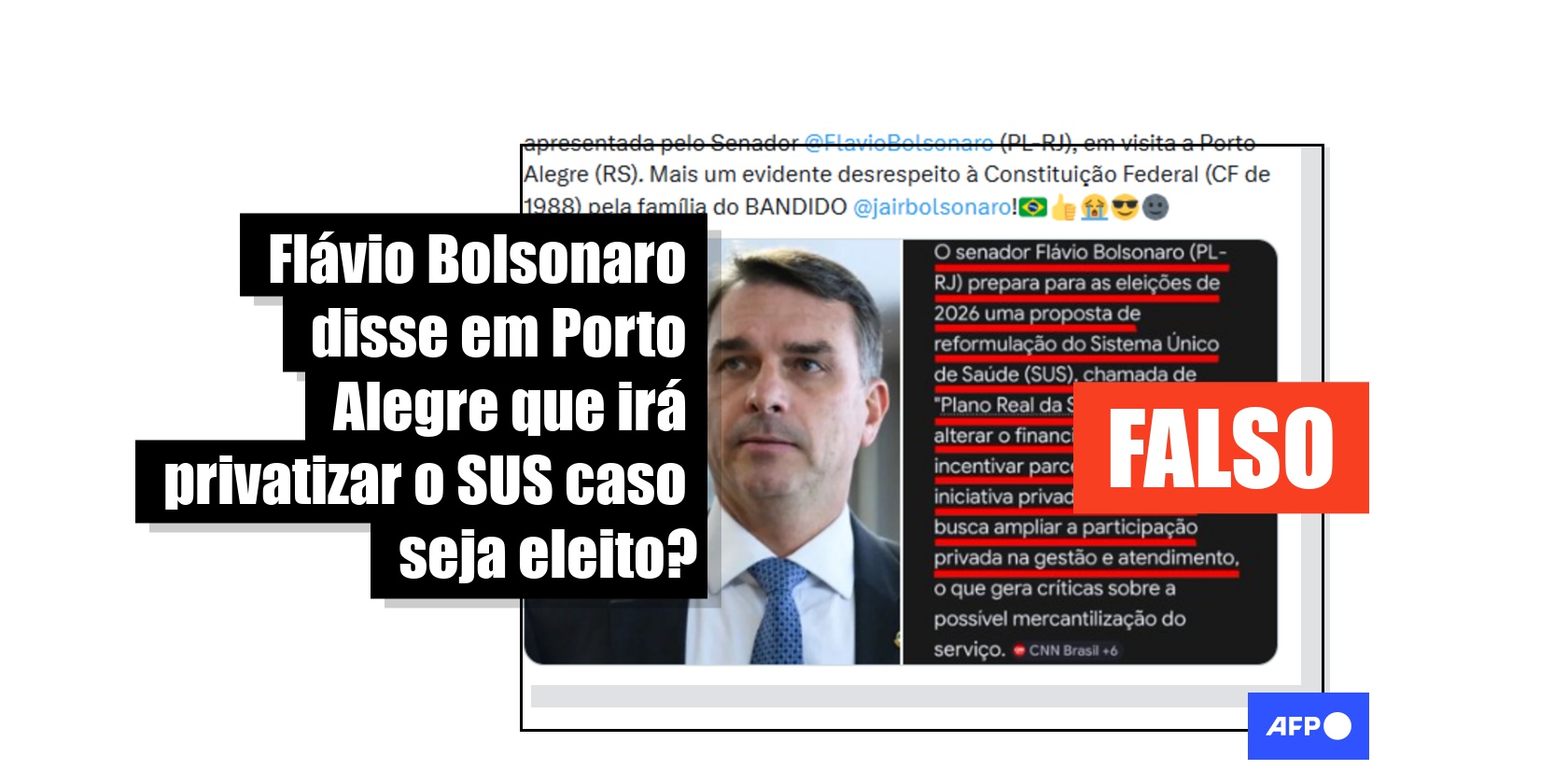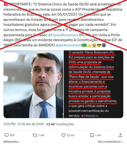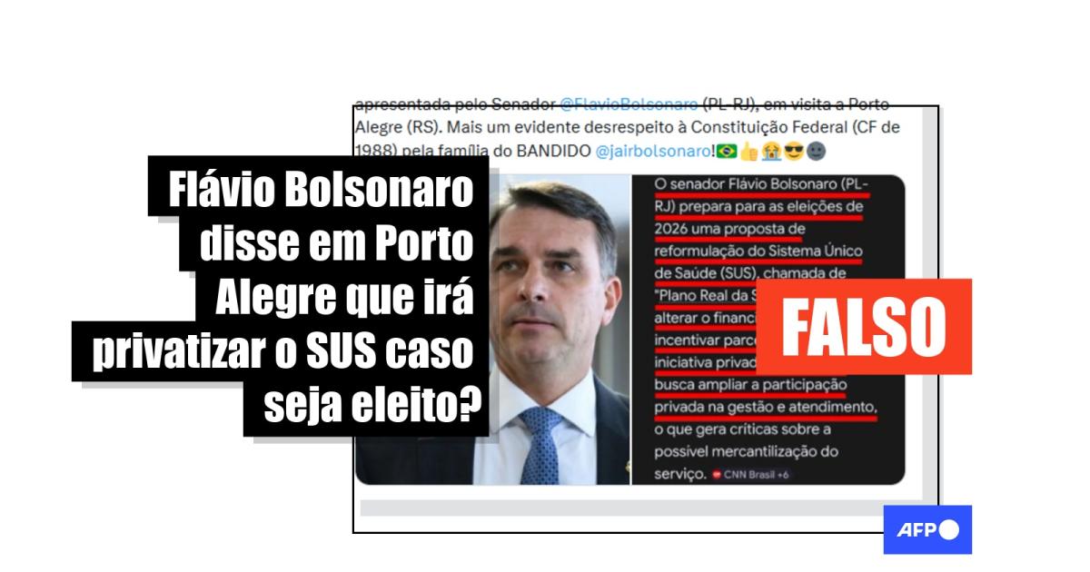 Entre os dias 10 e 11 de abril de 2026, o senador e pré-candidato à Presidência Flávio Bolsonaro (PL) esteve em Porto Alegre, no Rio Grande do Sul, onde discursou em eventos do partido e no Fórum da Liberdade. Desde então, publicações nas redes sociais com mais de 33 mil interações alegam que o pré-candidato afirmou, na cidade, que irá privatizar o Sistema Único de Saúde (SUS) caso seja eleito. Mas não há nenhum registro de fala do tipo nas gravações de seus discursos. Além disso, os conteúdos distorcem uma notícia da CNN Brasil sobre o estudo de uma proposta para o SUS.