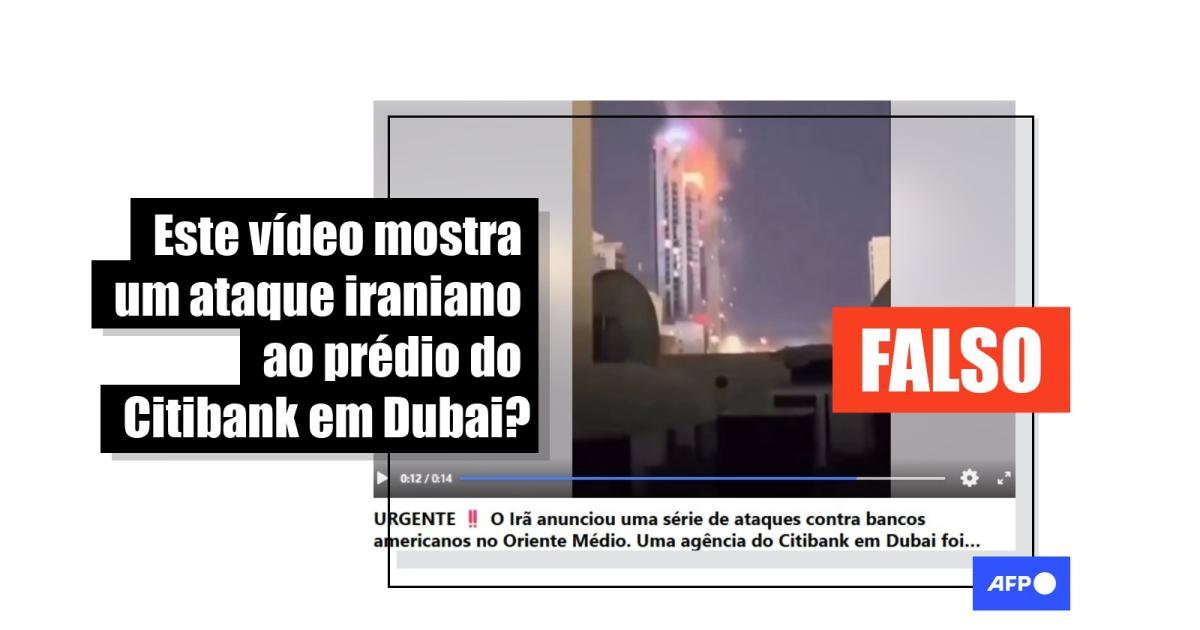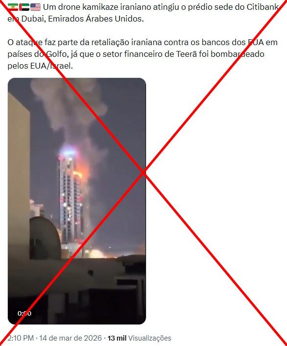 Um vídeo compartilhado no Instagram mostra o momento de uma explosão em um edifício, com uma mensagem: “EMIRADOS ÁRABES UNIDOS - Mísseis iranianos atingiram um escritório do Citibank em Dubai, nos Emirados Árabes Unidos”.