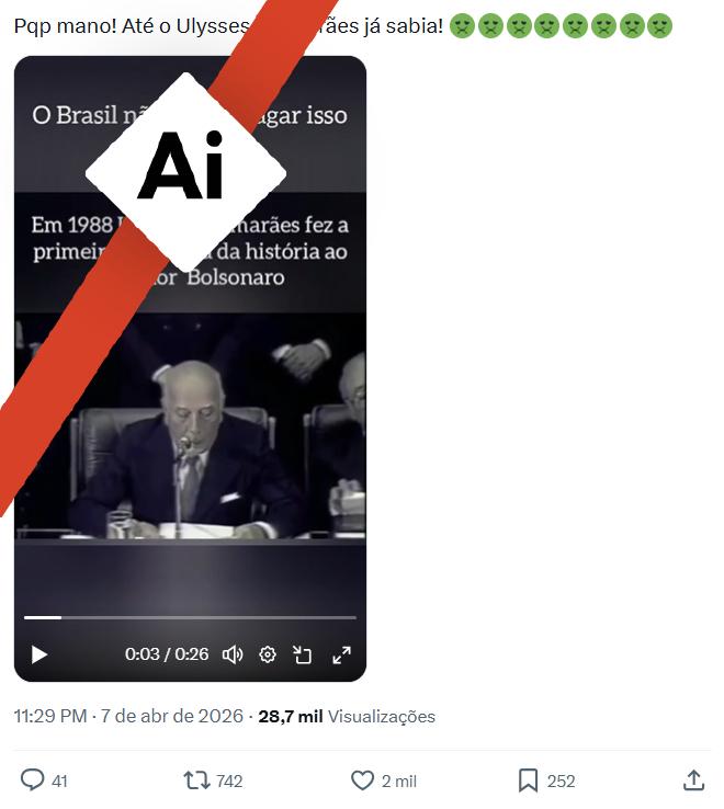 Um vídeo em que o político Ulysses Guimarães supostamente faz denúncias contra Jair Bolsonaro em 1988 foi visualizado mais de 200 mil vezes nas redes sociais desde 3 de abril de 2026. Mas, na verdade, o registro original mostra sua fala durante a promulgação da Constituição, em 5 de outubro de 1988, e foi adulterado com inteligência artificial.