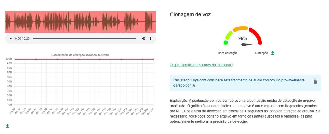 Uma análise do áudio viralizado, com a ferramenta Hiya do InVID WeVerify, indicou 99% de probabilidade do áudio ter sido gerado por inteligência artificial.