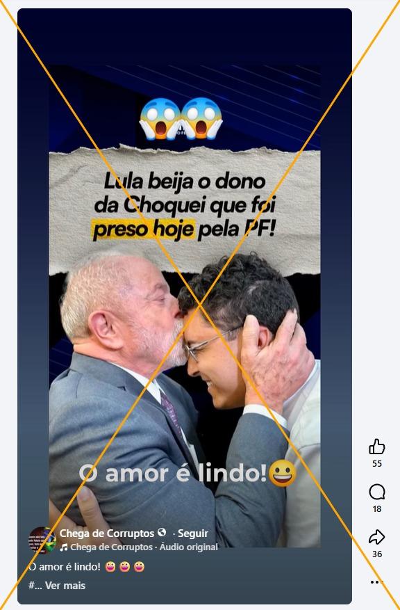 “Lula beija o dono da Choquei que foi preso hoje pela PF” é a frase sobreposta à foto publicada pelo deputado federal Sóstenes Cavalcante (PL-RJ) no Instagram. A imagem, em que o presidente Lula beija a testa de um homem, circula com a mesma alegação no Facebook, no Kwai e no X.