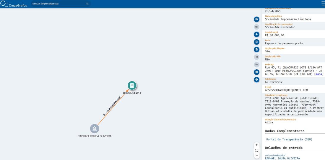 Por meio de uma busca na ferramenta CruzaGrafos, da Associação Brasileira de Jornalismo Investigativo (Abraji), o Checamos consultou o CNPJ da página. De acordo com as informações, atualmente, Raphael Sousa Oliveira consta como o único sócio-administrador da empresa “R. OLIVEIRA PUBLICIDADE E MARKETING DIGITAL LTDA” cujo nome fantasia é “CHOQUEI MKT”.