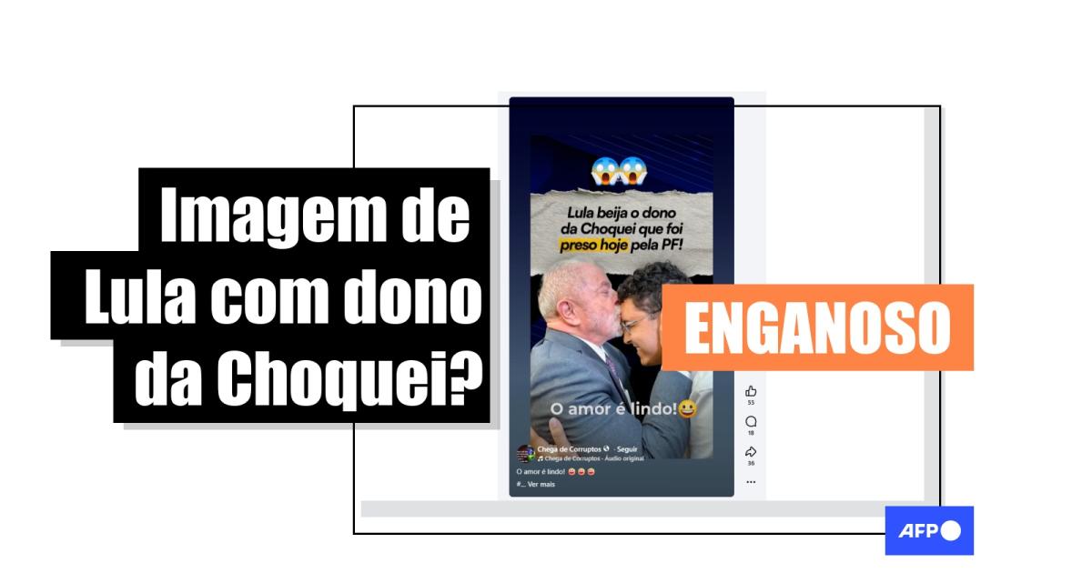 O dono da página de entretenimento Choquei, Raphael Sousa Oliveira, foi preso em meados de abril de 2026, como parte de uma operação da Polícia Federal que visava desarticular uma organização criminosa que movimentou ilicitamente mais de R$ 1,6 bilhão. Diante disso, publicações visualizadas mais de 130 mil vezes compartilham uma imagem que supostamente mostra o presidente Luiz Inácio Lula da Silva (PT) beijando a testa de Oliveira. Isso não é verdade: o homem na imagem é Júnior Silva, que trabalha na página mas que não foi alvo da operação, conforme informou o Ministério Público Federal (MPF) à AFP.