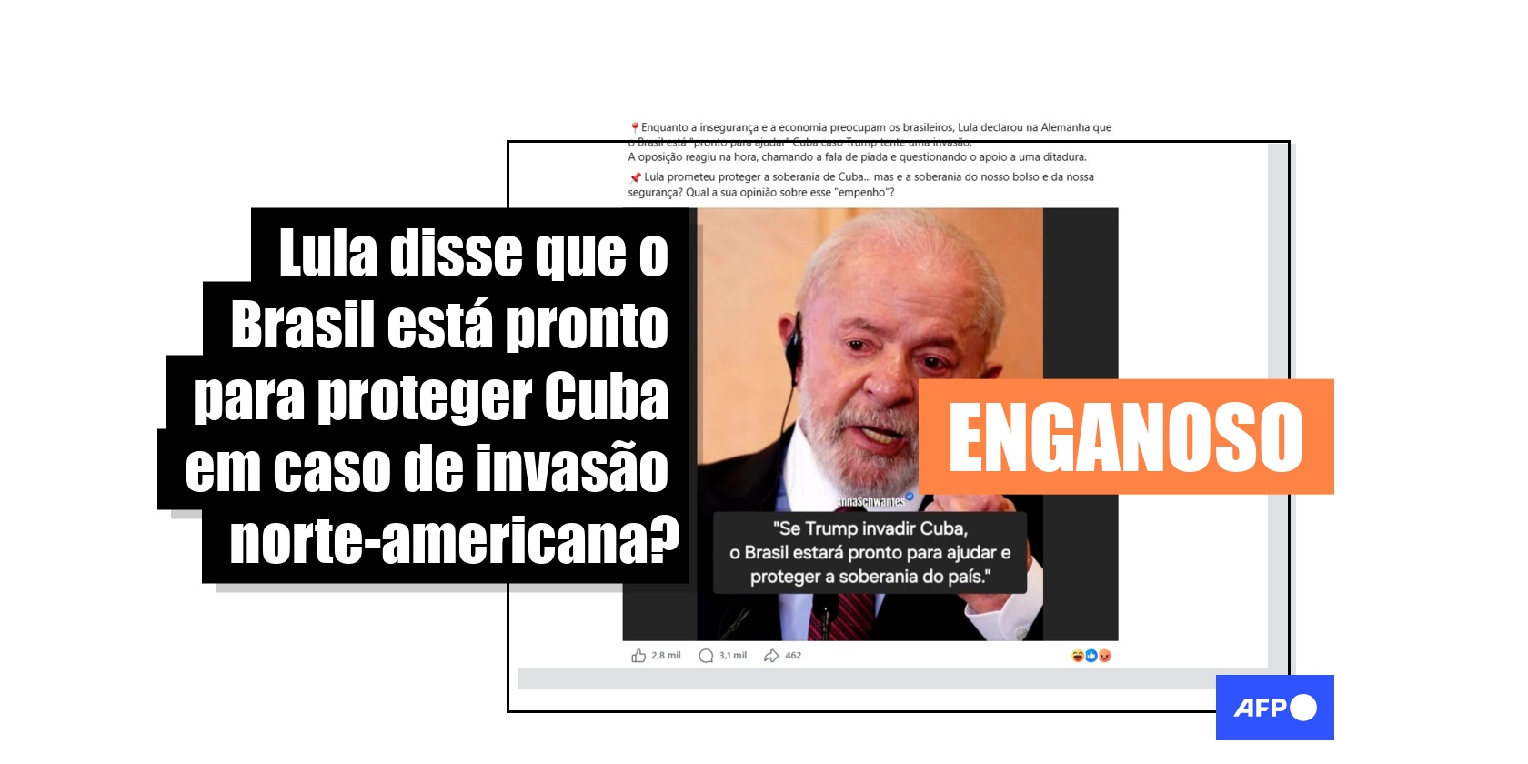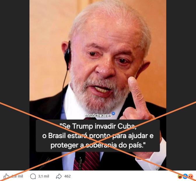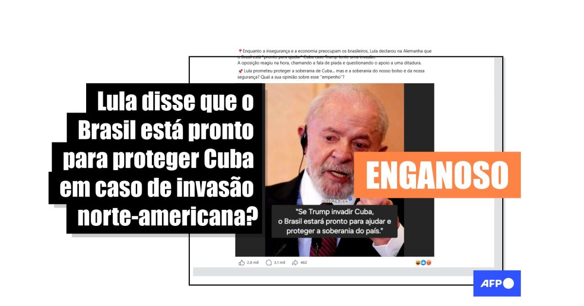 Em 16 de abril de 2026, o presidente Luiz Inácio Lula da Silva (PT) cumpriu agenda oficial na Europa. Desde o dia 20, publicações no Facebook que somam mais de 10 mil interações alegam que Lula teria afirmado, na Alemanha, que o Brasil estaria pronto para proteger a soberania de Cuba no caso de uma invasão ordenada por Donald Trump. Mas, embora Lula tenha criticado intervenções em diversos países e também o embargo norte-americano a Cuba, não há registro público de que o presidente tenha sugerido proteger o país caribenho em sua passagem pelo país.