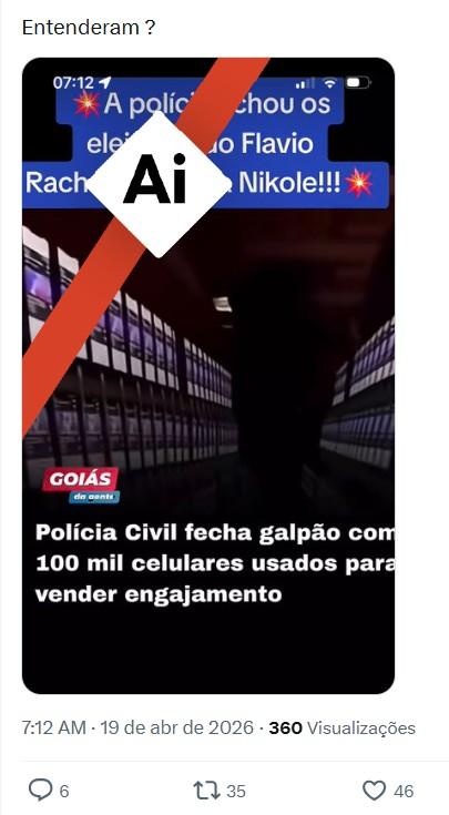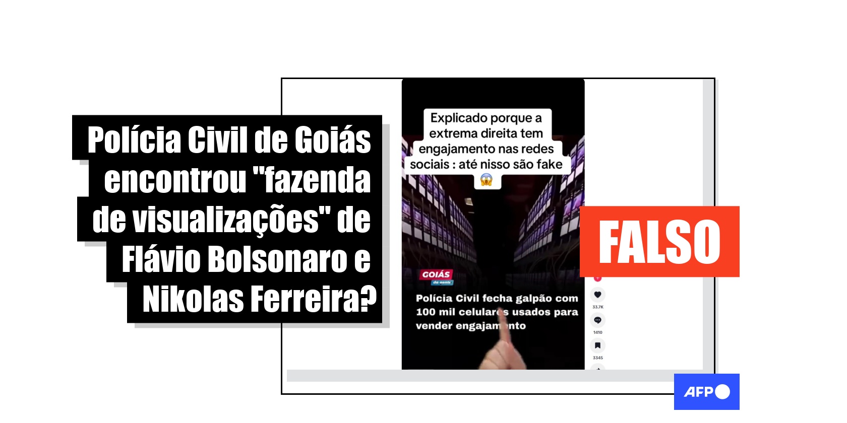 Não é verdade que a Polícia Civil de Goiás (PCGO) tenha descoberto um galpão com mais de 100 mil celulares usados para gerar engajamento nas redes sociais de Flávio Bolsonaro (PL) e Nikolas Ferreira (PL). Publicações com essa alegação somam mais de 1 milhão de interações nas redes sociais em abril de 2026 e compartilham um vídeo da suposta “fazenda de engajamento”, na qual vários celulares aparecem operando em conjunto dentro de um “galpão”. Mas não há registro da suposta operação e a gravação apresenta indícios de ter sido gerada por inteligência artificial (IA).