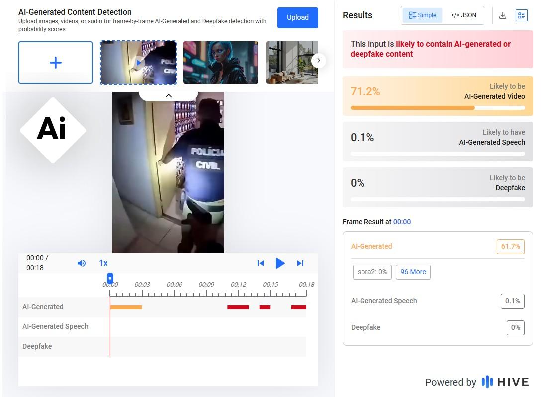 Uma análise da ferramenta de detecção de conteúdos sintéticos Hive Moderation apontou que a gravação tem 71,2% de probabilidade de ter sido gerada com IA.