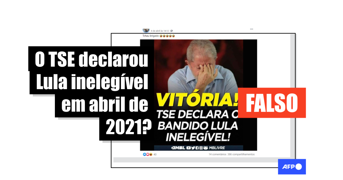 “Vitória! TSE declara o bandido Lula inelegível!”, diz texto sobreposto a uma foto de Lula com a mão no rosto, compartilhada mais de 2 mil vezes no Facebook (1, 2, 3) desde o último dia 3 de abril. “Poxa, eu estava contando com a humilhação nas eleições em 2022”, comentou um usuário.