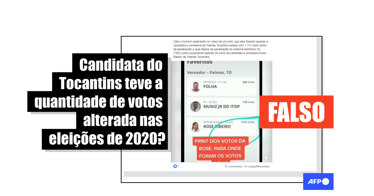“Olha o homem explicando no vídeo de um print, que eles fizeram quando a candidata a vereadora de Palmas Tocantins estava com 1.111 votos antes da paralisação,a qual depois da paralisação do sistema eletrônico do (TSE),volta computando apenas 58 votos da candidata a vereadora Rose Ribeiro de Palmas Tocantins”, indica a legenda de uma das postagens compartilhadas dezenas de vezes no Facebook (1, 2, 3), algumas com duas gravações diferentes com base na mesma denúncia.