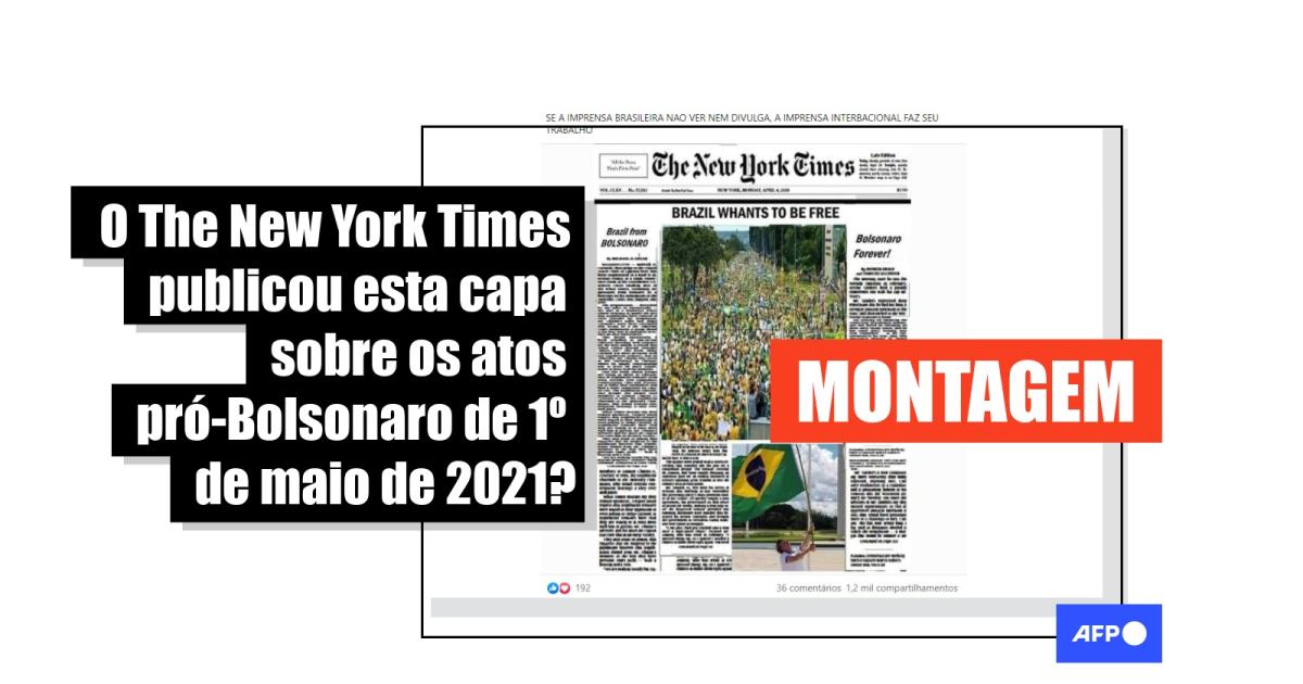 É uma montagem a capa do The New York Times sobre os atos pró-Bolsonaro de 1º de maio