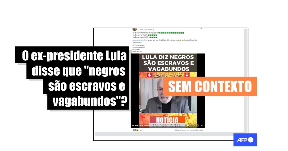 “Lula diz negros são escravos e vagabundos”, diz o texto sobreposto a uma gravação do ex-presidente Lula compartilhada no Facebook (1, 2, 3).