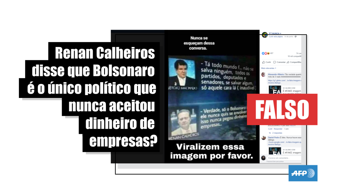 Segundo as postagens (1, 2, 3), Sérgio Machado teria dito a Renan: “Tá todo mundo f… não se salva ninguém, todos os partidos, deputados e senadores, se salvar algum, só aquele cara lá (inaudível)”. Ao que Renan teria respondido: “Verdade, só o Bolsonaro mesmo, ele nunca quis se envolver com isso nunca pegou dinheiro das empresas…”.