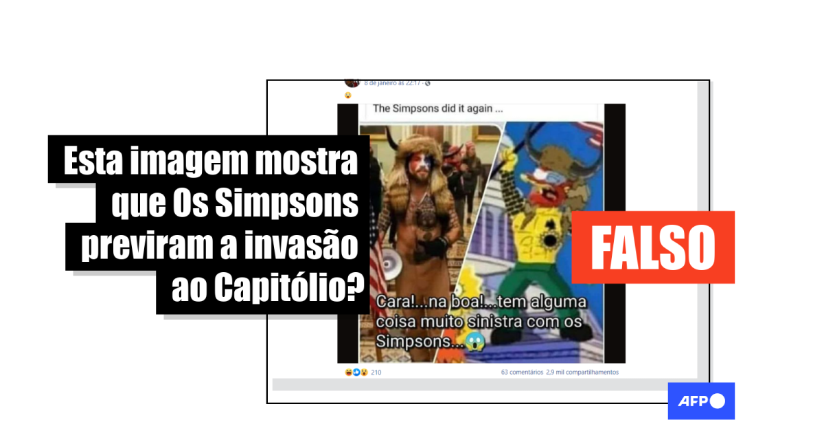 Em resumo, a série animada “Os Simpsons” não previu que um homem vestido com peles, chifres e o rosto pintado invadiria o Capitólio dos Estados Unidos. Trata-se de uma montagem a partir de várias ilustrações.
