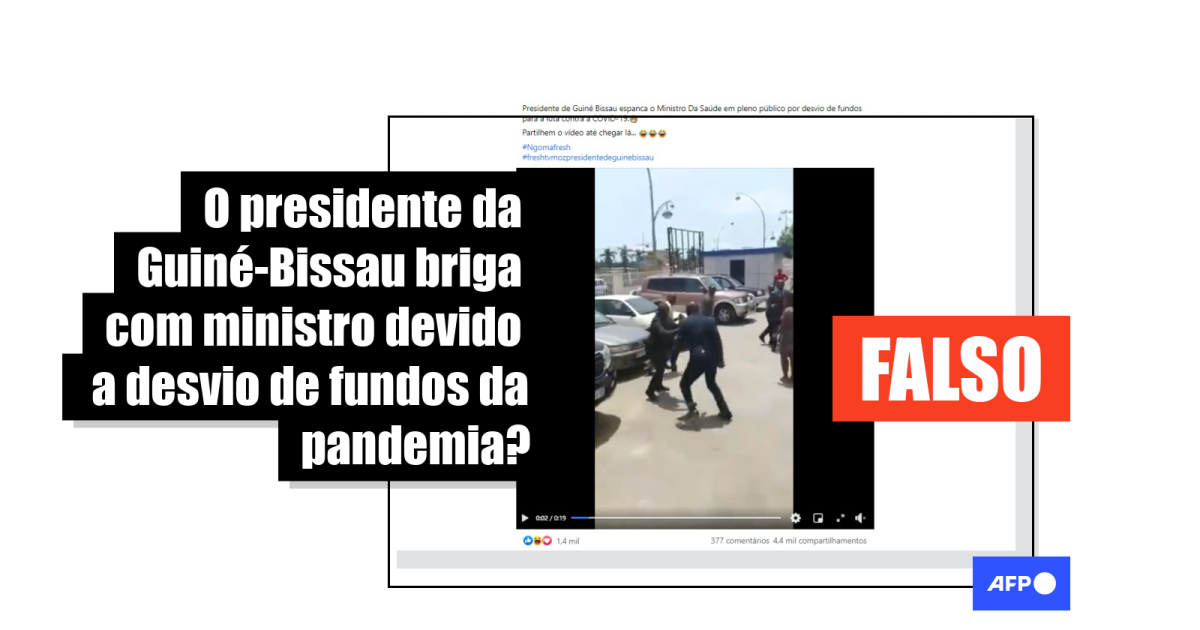 “Presidente de Guiné Bissau espanca o Ministro da Saúde em pleno público por desvio de fundos para a luta contra a COVID-19”, dizem publicações compartilhadas mais de 5 mil vezes no Facebook (1, 2), Twitter e YouTube ao menos desde 18 de setembro.