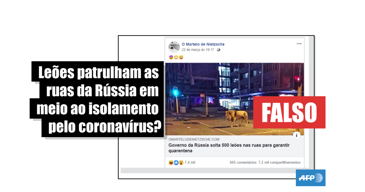 “Rússia inovando no Combate ao CORONAVÍRUS soltou 500 leões na rua para evitar aglomerações…”, “A Rússia soltou leões nas ruas para as pessoas não saírem de casa. Melhor país kkkkkk [sic]” e “Governo da Rússia solta 500 leões nas ruas para garantir quarentena”, são algumas das afirmações que acompanham as publicações, compartilhadas no Facebook (1, 2) mais de 23 mil vezes, com mais de 123 mil curtidas no Twitter (1, 2, 3, 4).
