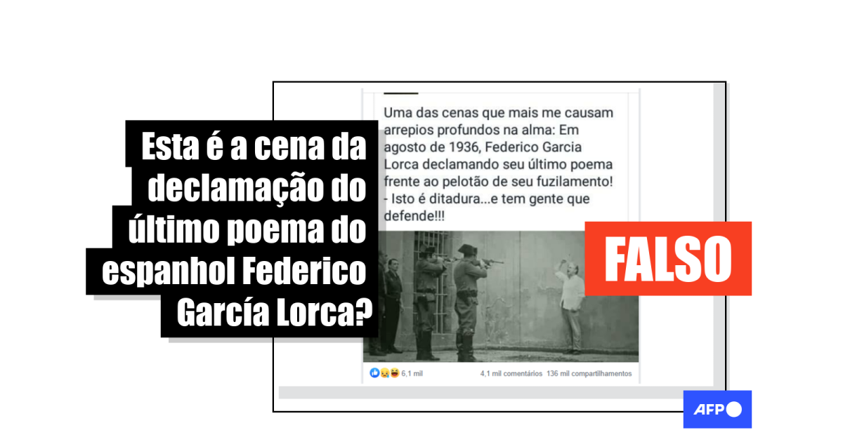 “Uma das cenas que mais me causam arrepios profundos na alma: Em agosto de 1936, Federico Garcia Lorca declamando seu último poema frente ao pelotão de seu fuzilamento! - Isto é ditadura... e tem gente que defende!!!”, diz o texto que acompanha a imagem, compartilhada mais de 167 mil vezes no Facebook (1, 2, 3, 4) desde agosto de 2015 e que continua circulando até hoje.