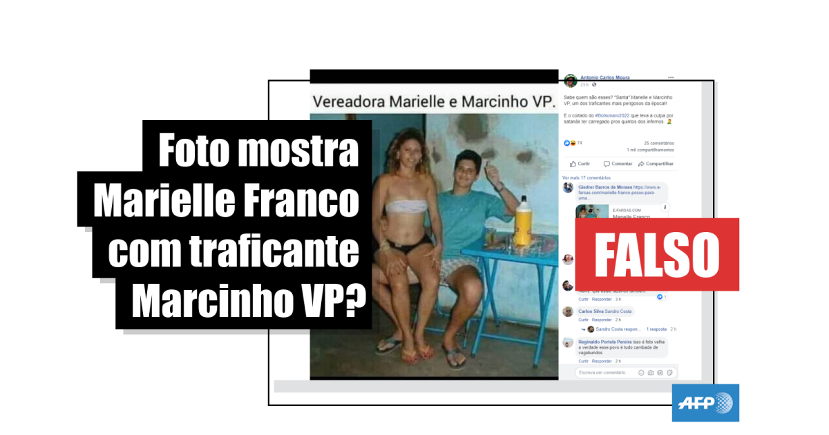 “Sabe quem são esses? ‘Santa’ Marielle e Marcinho VP, um dos traficantes mais perigosos da época!! E o coitado do #Bolsonaro2022 que leva a culpa por satanás ter carregado pros quintos dos infernos”, diz publicação compartilhada mais de 1 mil vezes no Facebook desde 12 de março de 2020.