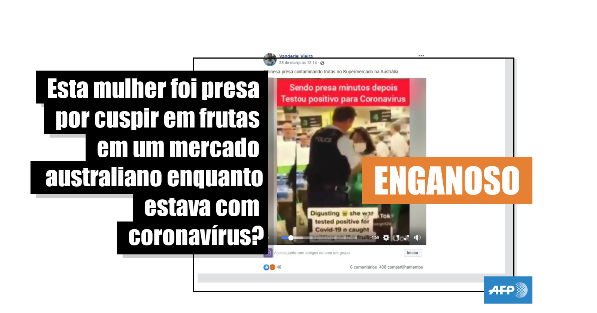 O vídeo desta postagem também conta com a mensagem sobreposta que diz que a mulher havia testado positivo para COVID-19 e que estava sendo presa por cuspir em cima de frutas.