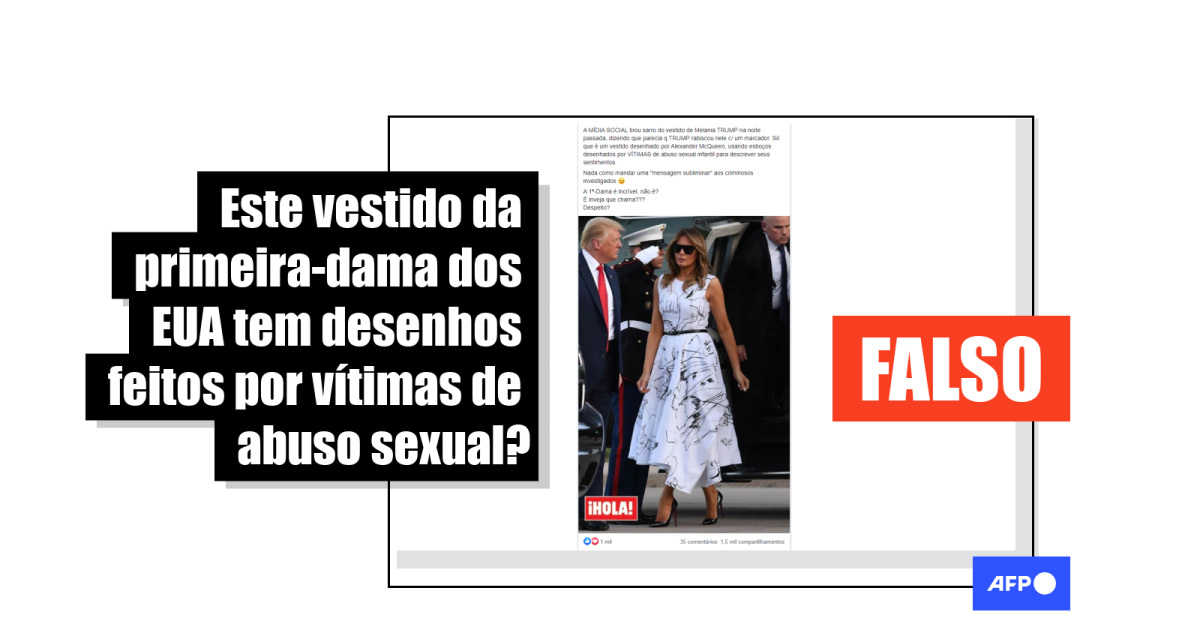 “A imprensa debochou do vestido de Melania Trump dizendo que parecia que @realDonaldTrump havia rabiscado nele com um marcador. Acontece que é um vestido desenhado por Alexander McQueen, usando esboços desenhados por VÍTIMAS DE ABUSO SEXUAL INFANTIL para descrever seus sentimentos”, dizem as legendas das publicações, compartilhadas no Facebook (1, 2, 3, 4) mais de 3,6 mil vezes desde o último dia 5 de julho.