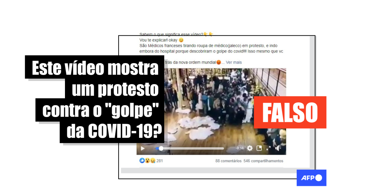 “Sabem o que significa esse vídeo? Vou te explicar! okay. São Médicos franceses tirando roupa de médico (jaleco) em protesto, e indo embora do hospital porque descobriram o golpe do covid [sic]!!! Isso mesmo que vc leu !!! A mentira por trás da nova ordem mundial”, diz legenda que acompanha o vídeo, em postagem compartilhada mais de 500 vezes no Facebook desde o último dia 10 de julho.