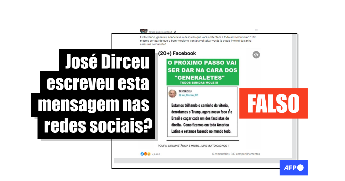 Procurado pela AFP Checamos, Dirceu afirmou, por meio de uma assessora de imprensa: “Trata-se de mais uma postagem fake. Minhas opiniões são públicas e sempre via meus artigos ou entrevistas”.