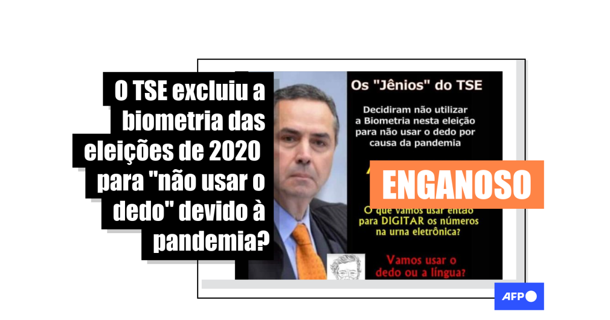“Os ‘Jênios’ do TSE decidiram não utilizar a Biometria nesta eleição para não usar o dedo por causa da pandemia. Agora pergunta para eles o que vamos usar então para DIGITAR os números na urna eletrônica? Vamos usar o dedo ou a língua?”, diz o texto compartilhado milhares de vezes no Facebook (1, 2, 3), que acompanha uma foto do atual presidente do Tribunal Superior Eleitoral (TSE), o ministro Luís Roberto Barroso.