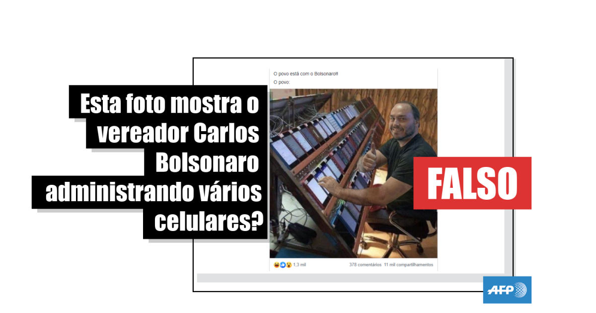 “O povo está com o Bolsonaro!! O povo:”, dizem as legendas das publicações, compartilhadas mais de 11 mil vezes no Facebook (1, 2, 3, 4), que acompanham uma foto de Carlos Bolsonaro, o segundo filho do presidente Jair Bolsonaro, diante de vários celulares, como se estivesse administrando-os.