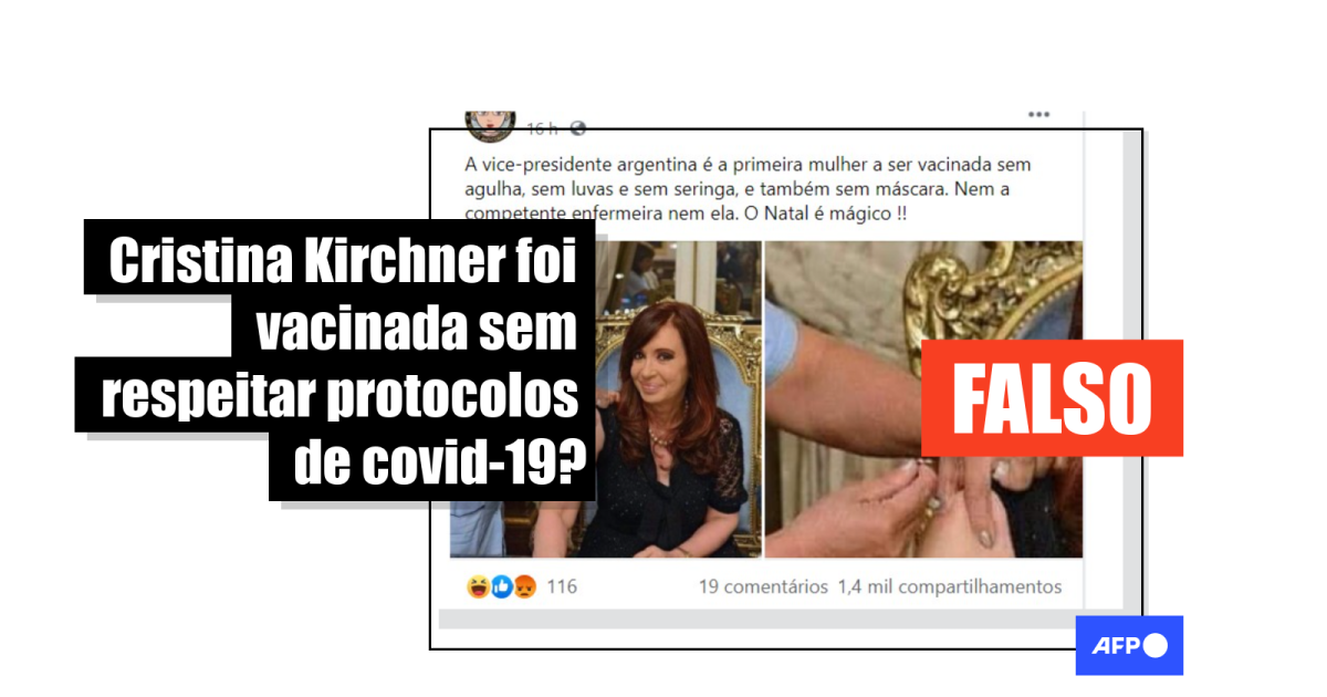 A imagem foi compartilhada no Facebook (1, 2, 3, 4), no Twitter (1, 2) e o conteúdo foi enviado ao WhatsApp do AFP Checamos para verificação. “A vice-presidente argentina é a primeira mulher a ser vacinada sem agulha, sem luvas e sem seringa, e também sem máscara. Nem a competente enfermeira nem ela. O Natal é mágico!!”, dizem as publicações que começaram a circular poucas horas depois de o governo dar início à campanha de vacinação contra a covid-19 com a vacina russa Sputnik V.