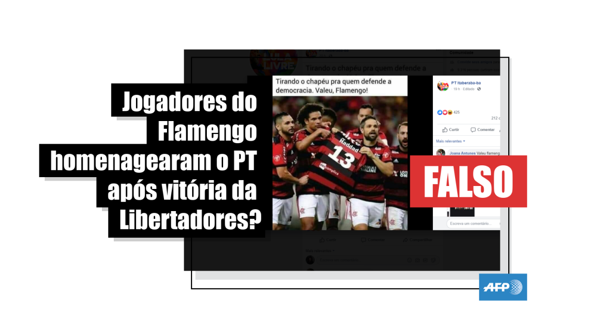 Em resumo, é falso que a imagem viralizada mostre jogadores do Flamengo homenageando o PT após vencerem a Libertadores no último dia 23 de novembro. A foto foi alterada digitalmente para incluir o número 13 e o nome de Fernando Haddad. No registro original, os jogadores homenageavam um zagueiro do time, que havia se machucado.