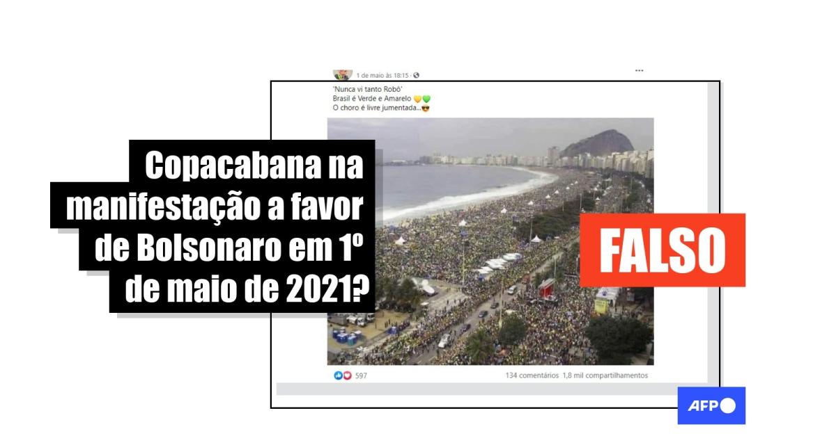 Amplamente compartilhadas no Facebook (1, 2, 3), Twitter (1, 2, 3) e Instagram, as publicações elogiam o suposto alto comparecimento a um dos atos pró-Bolsonaro realizados no Dia do Trabalho. “A imagem deixou a esquerda apavorada!! Copacabana parou o Rio!”, diz uma das postagens, que também circulam em espanhol.