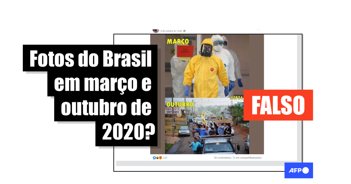Em resumo, é falso que as imagens compartilhadas nas redes mostrem a situação do Brasil em março e outubro deste ano. A imagem de um homem com equipamento de proteção individual mostra o presidente russo em Moscou. Já a foto de uma carreata foi feita em Goiânia, mas em setembro de 2016.