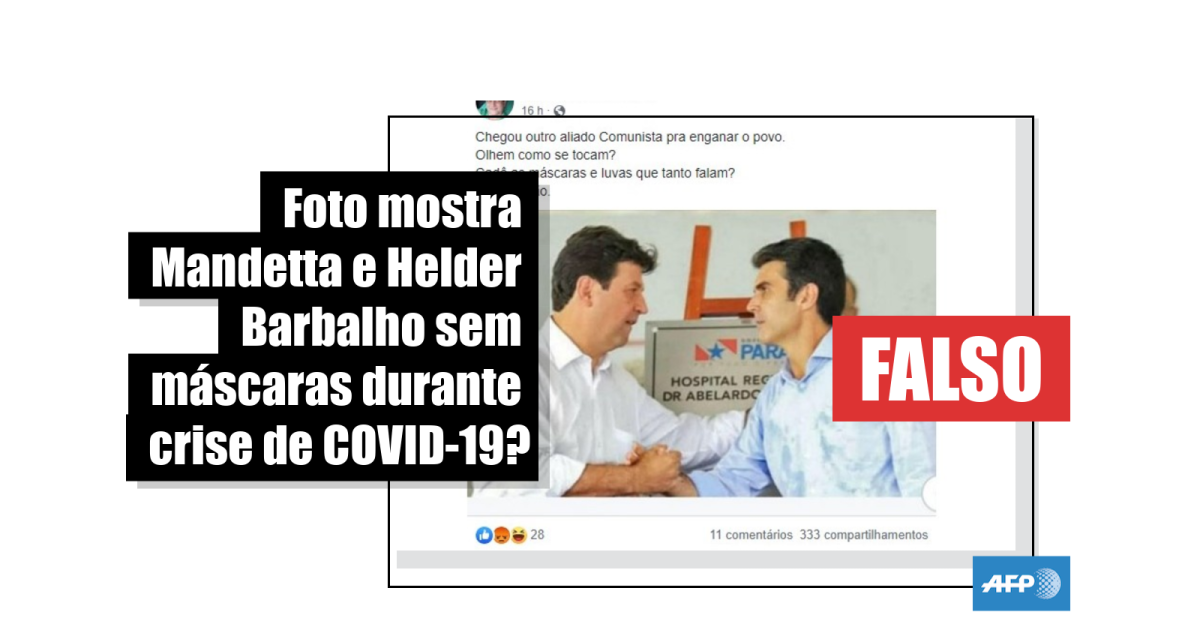 “A convite de Helder, Mandetta chega em Belém para reforçar a equipe estadual de combate à COVID-19”, diz o texto que acompanha a foto, em publicação compartilhada centenas de vezes no Facebook. Na legenda, o usuário chama atenção para o fato de os dois políticos estarem, supostamente, descumprindo as recomendações de prevenção em meio ao surto do novo coronavírus.