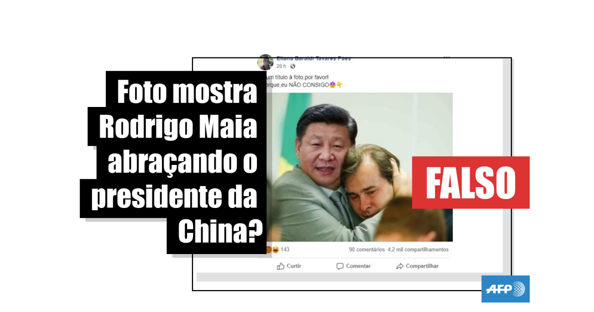 A foto em que Rodrigo Maia abraça o presidente chinês, Xi Jinping, é uma montagem