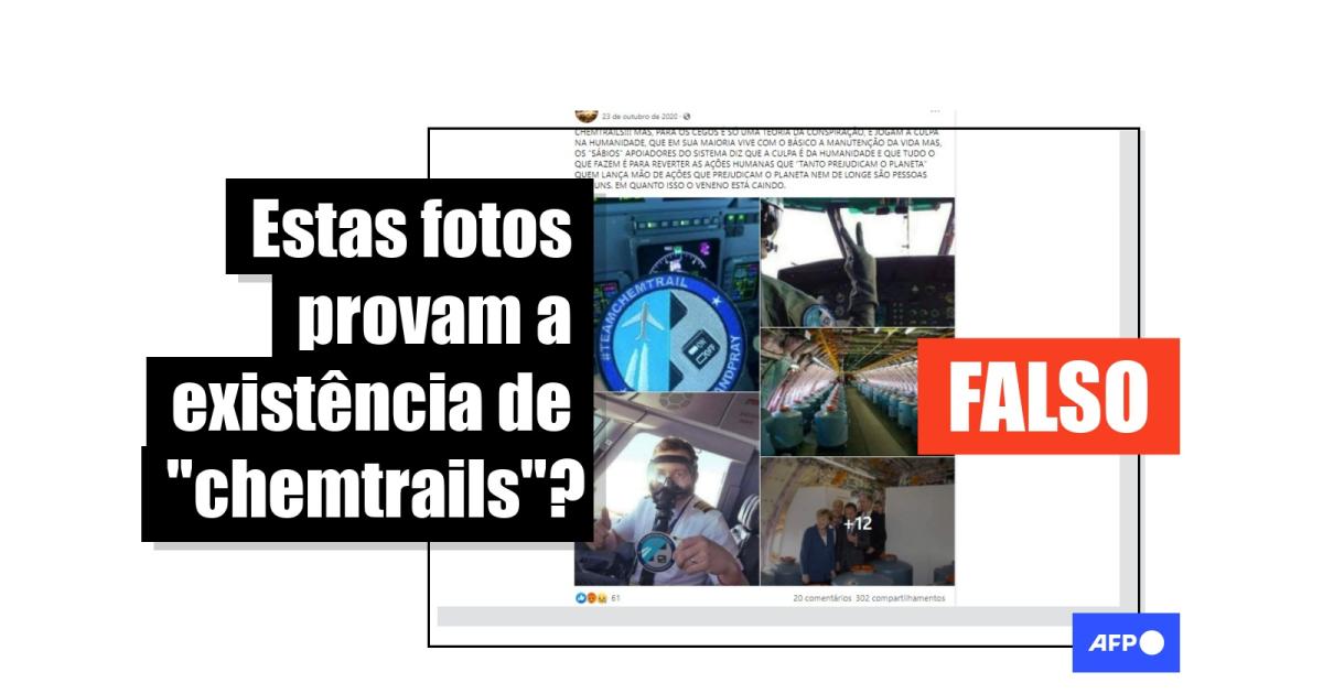 Outras fotos das postagens viralizadas no Facebook mostram pilotos de companhias aéreas e dois homens com uniformes do Exército dos Estados Unidos e um escudo que diz #TEAMCHEMTRAIL