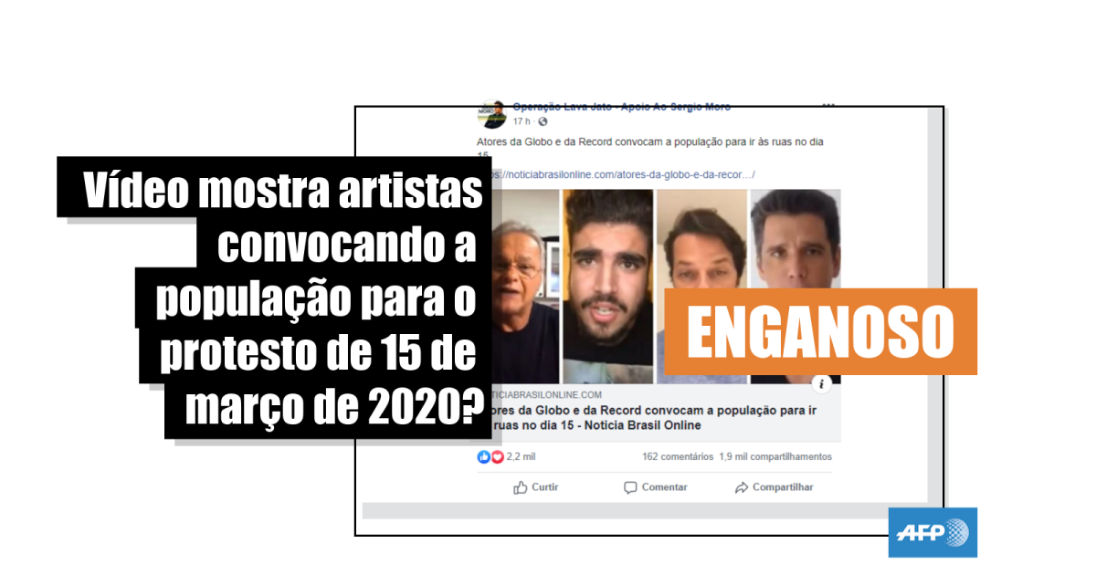 “Atores da Globo e da Record convocam a população para ir às ruas no dia 15 de março em defesa da moralidade e do governo Jair Bolsonaro”, dizem artigos (1, 2), compartilhados mais de 10 mil vezes em redes sociais desde o último dia 1º de março.