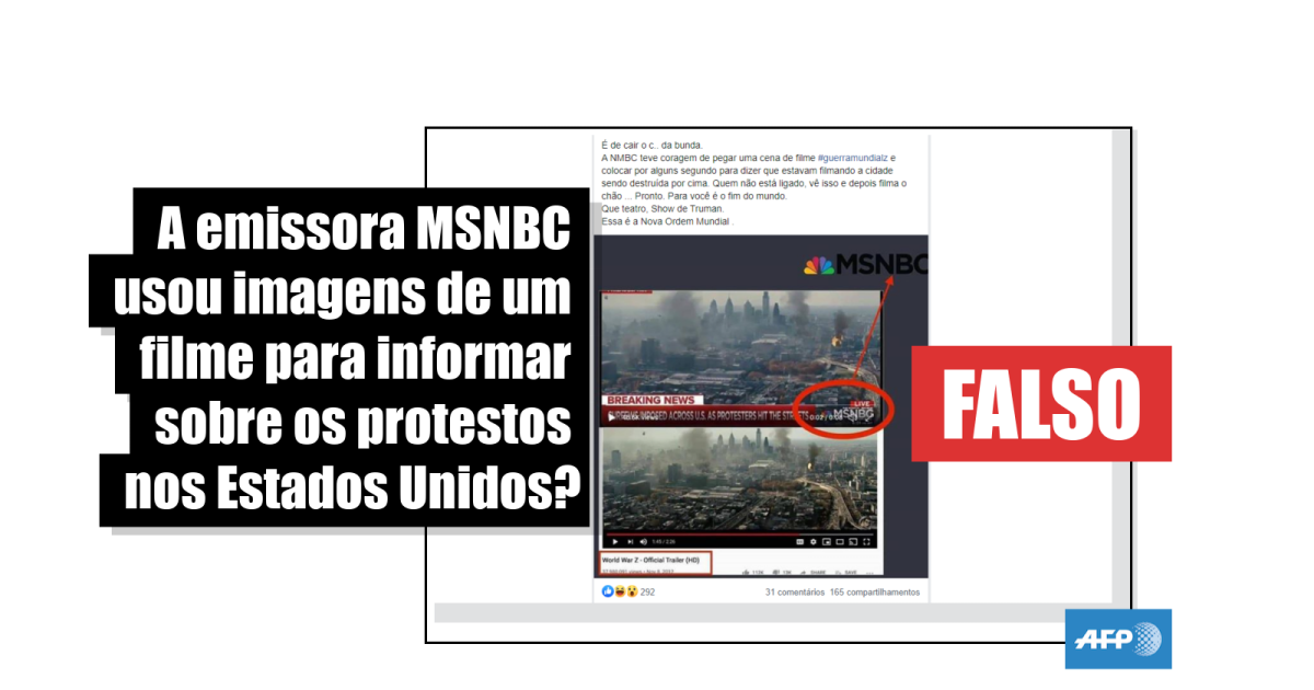 Em resumo, a emissora de notícias MSNBC dos Estados Unidos não usou as imagens do filme “Guerra Mundial Z” para informar sobre os protestos que atravessam todo o país pela morte de George Floyd. Trata-se, na verdade, de uma montagem satírica feita por um usuário do Twitter, que usa elementos gráficos e áudio do próprio canal.