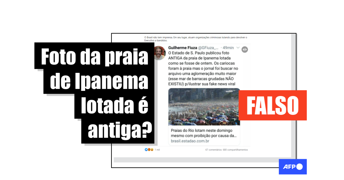 A maior parte das publicações, que também circularam no Instagram (1, 2) e registraram mais de 6 mil curtidas, usam a captura de tela de um tuíte feito pelo jornalista Guilherme Fiuza, que diz: “O Estado de S. Paulo publicou foto ANTIGA da praia de Ipanema lotada como se fosse ontem. Os cariocas foram à praia mas o jornal foi buscar no arquivo uma aglomeração muito maior (esse mar de barracas grudadas NÃO EXISTIU) p/ilustrar sua fake news viral”.