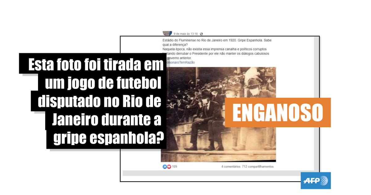 “Estádio do Fluminense no Rio de Janeiro em 1920. Gripe Espanhola. Sabe qual a diferença? Naquela época, não existia essa imprensa canalha e políticos corruptos tentando derrubar o Presidente por ele não manter os diálogos cabulosos do governo anterior. #BolsonaroTemRazão”, diz uma das publicações compartilhadas no Facebook (1, 2, 3) e Twitter (1, 2, 3).