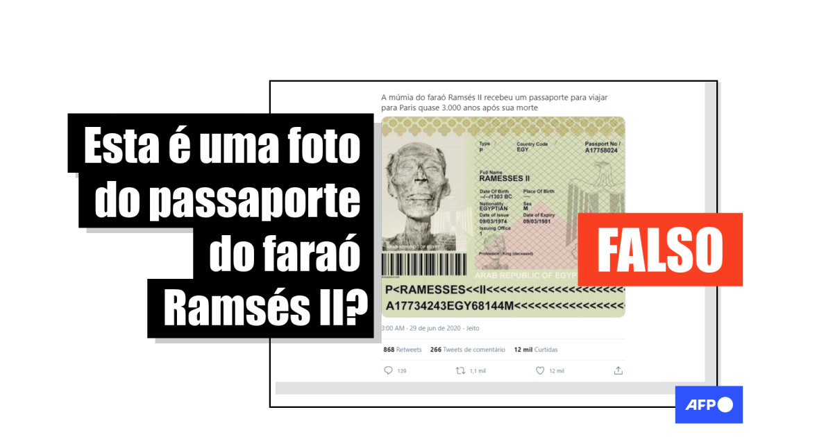 “Em 1974, a múmia do Faraó, Ramsés II, foi enviada em um vôo para Paris para trabalhos de preservação e manutenção. Mas como a lei francesa exigia que todas as pessoas, vivas ou mortas, voassem com um passaporte válido, o governo egípcio foi forçado a emitir um passaporte para o Faraó, 3.000 anos após sua morte”, indica uma das publicações no Facebook (1, 2, 3), juntamente com a suposta imagem do passaporte do faraó, mas confundindo o ano em que a múmia foi levada ao território francês.