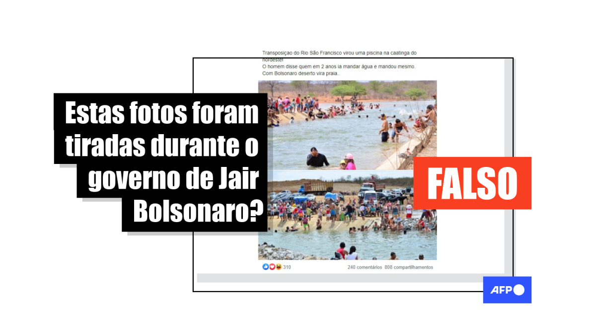 “Transposiçao do Rio São Francisco virou uma piscina na caatinga do nordeste! O homem disse quem em 2 anos ia mandar água e mandou mesmo. Com Bolsonaro deserto vira praia.. [sic]”, escreveu um usuário ao publicar as duas imagens no Facebook. “Bolsonaro tem muitos defeitos, mas ele conseguiu botar praia no deserto”, diz outra postagem.