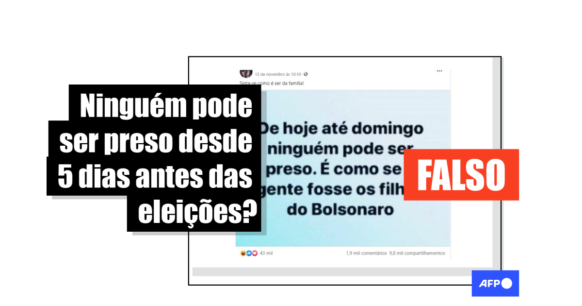 “De hoje até domingo ninguém pode ser preso. É como se a gente fosse os filhos do Bolsonaro”, diz um texto compartilhado mais de 25 mil vezes no Facebook (1, 2, 3), Twitter (1, 2, 3) e Instagram desde o último dia 10 de novembro, cinco dias antes da eleição municipal deste ano.
